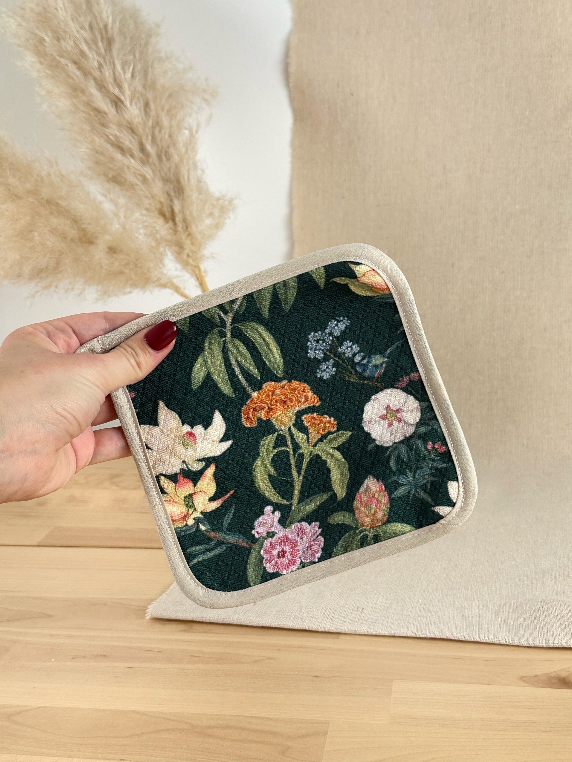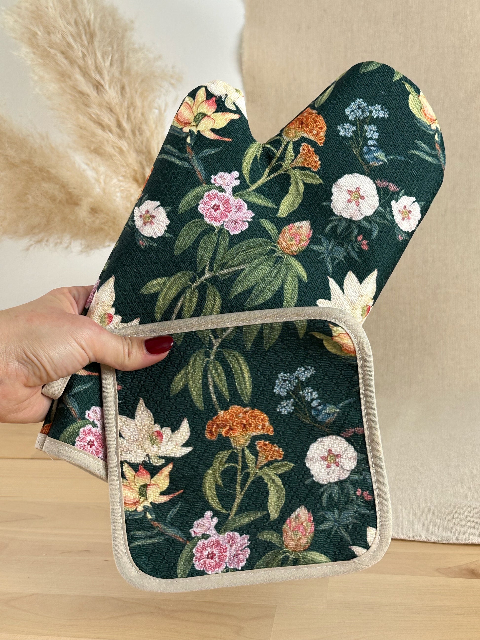 Apportez une touche d'élégance à votre cuisine avec cet ensemble manique et carré de protection, sublimés par de délicats motifs fleuris. En plus de leur praticité, ces accessoires se distinguent par leur design raffiné, parfaits pour ajouter du charme à vos moments en cuisine. Idéal pour manipuler vos plats avec style, cet ensemble allie fonctionnalité et esthétique.