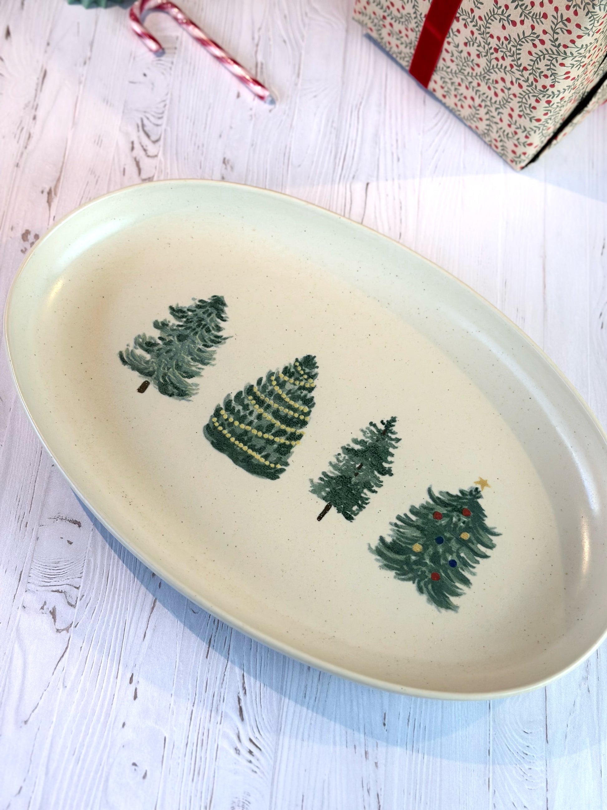 Apportez une touche de festivité à votre intérieur avec ce superbe plateau en grès fin décoré de sapins de Noël.