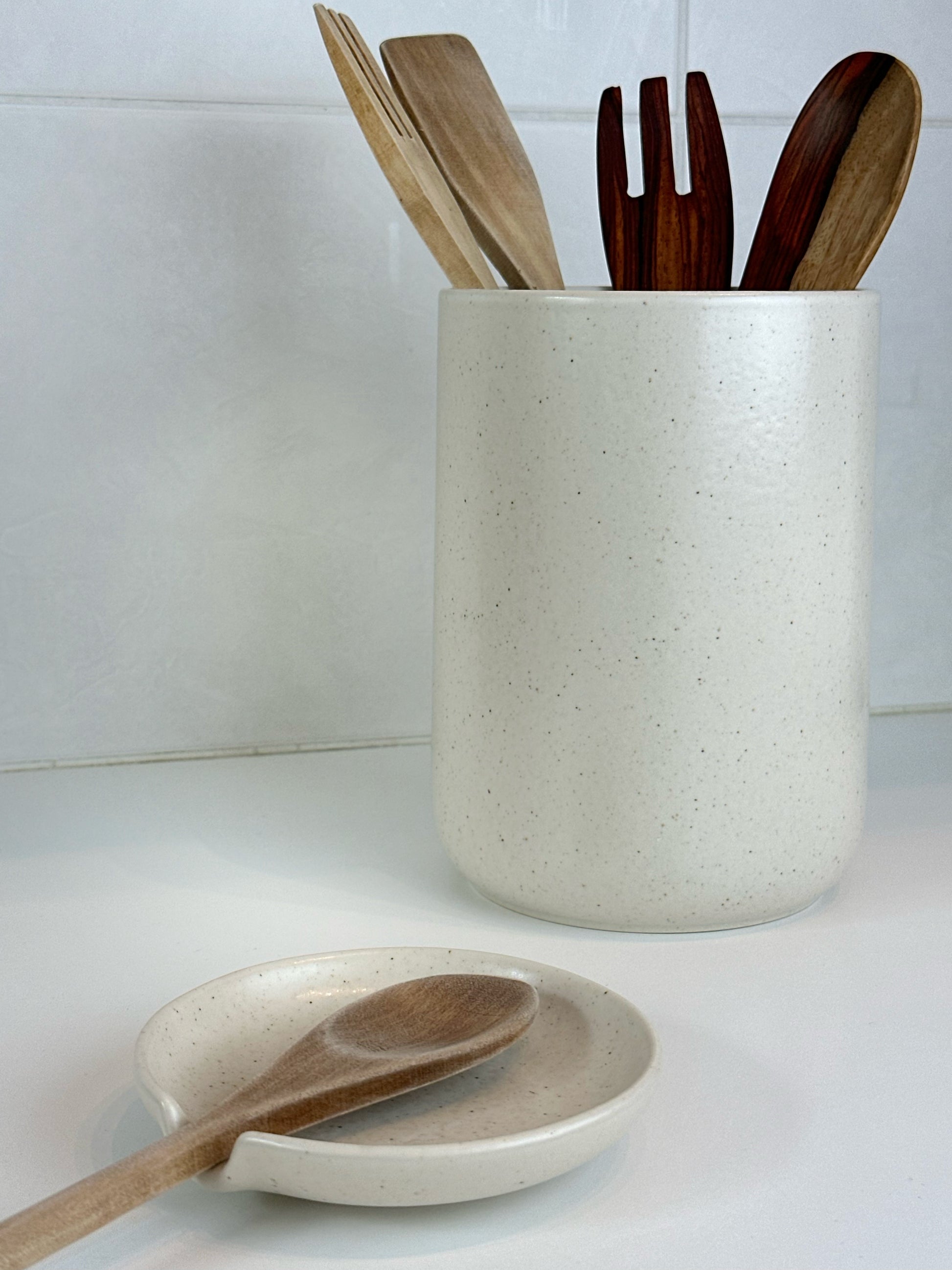 Ajoutez de la couleur à votre cuisine avec le pot à ustensiles vert d'eau, ou optez pour la sobriété avec l'élégant pot à ustensiles écru.
